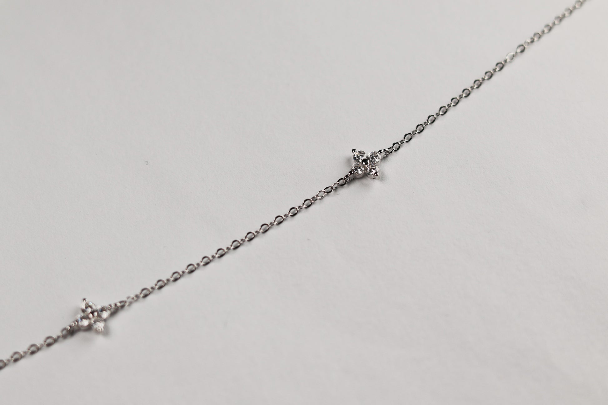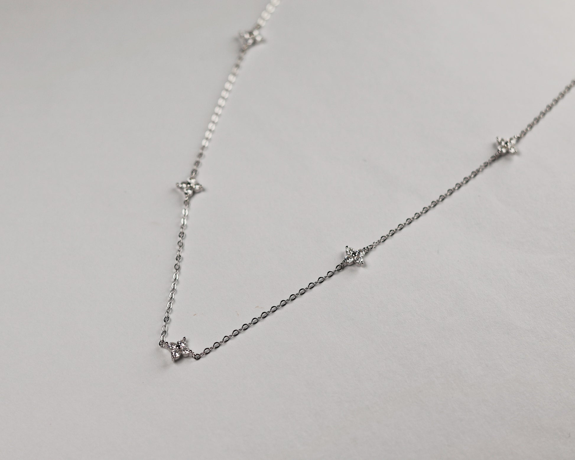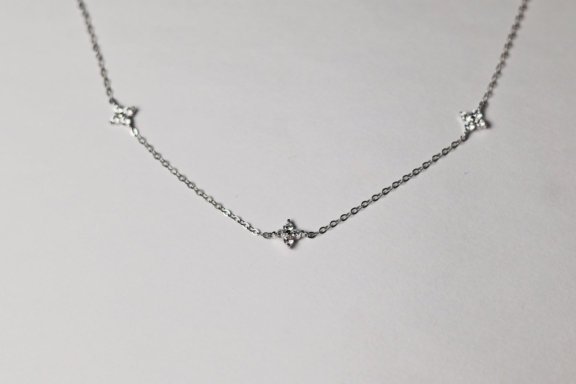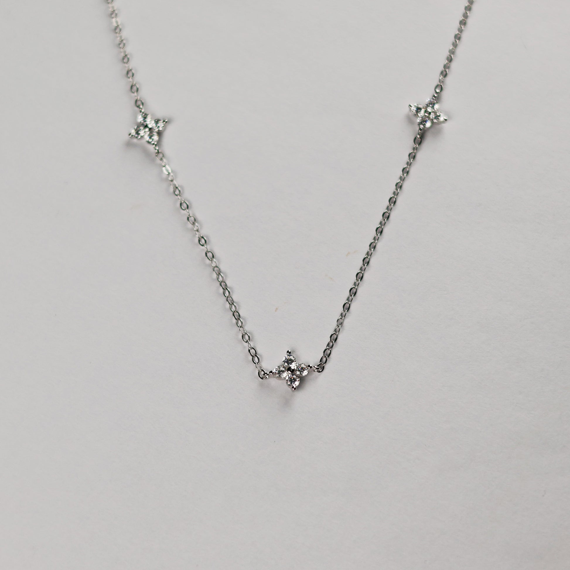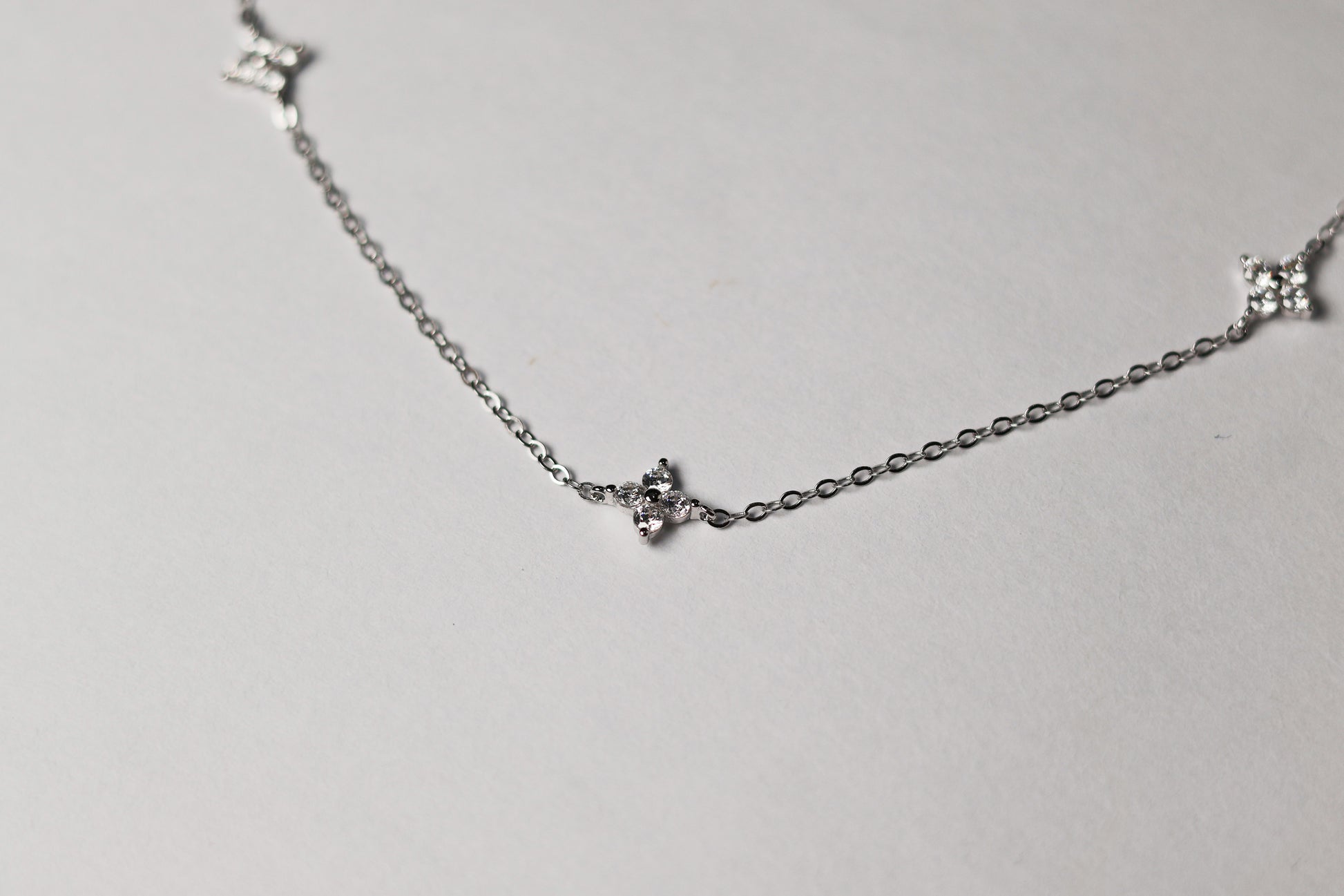 Collar delicado con detalles en forma de flor, elaborado en plata 925. Su diseño sutil y femenino aporta un brillo discreto que eleva cualquier look sin esfuerzo. Perfecto para quienes aman las piezas finas, ligeras y fáciles de combinar. Ideal para usar solo o en layering y darle un toque romántico y minimal a tu día a día.