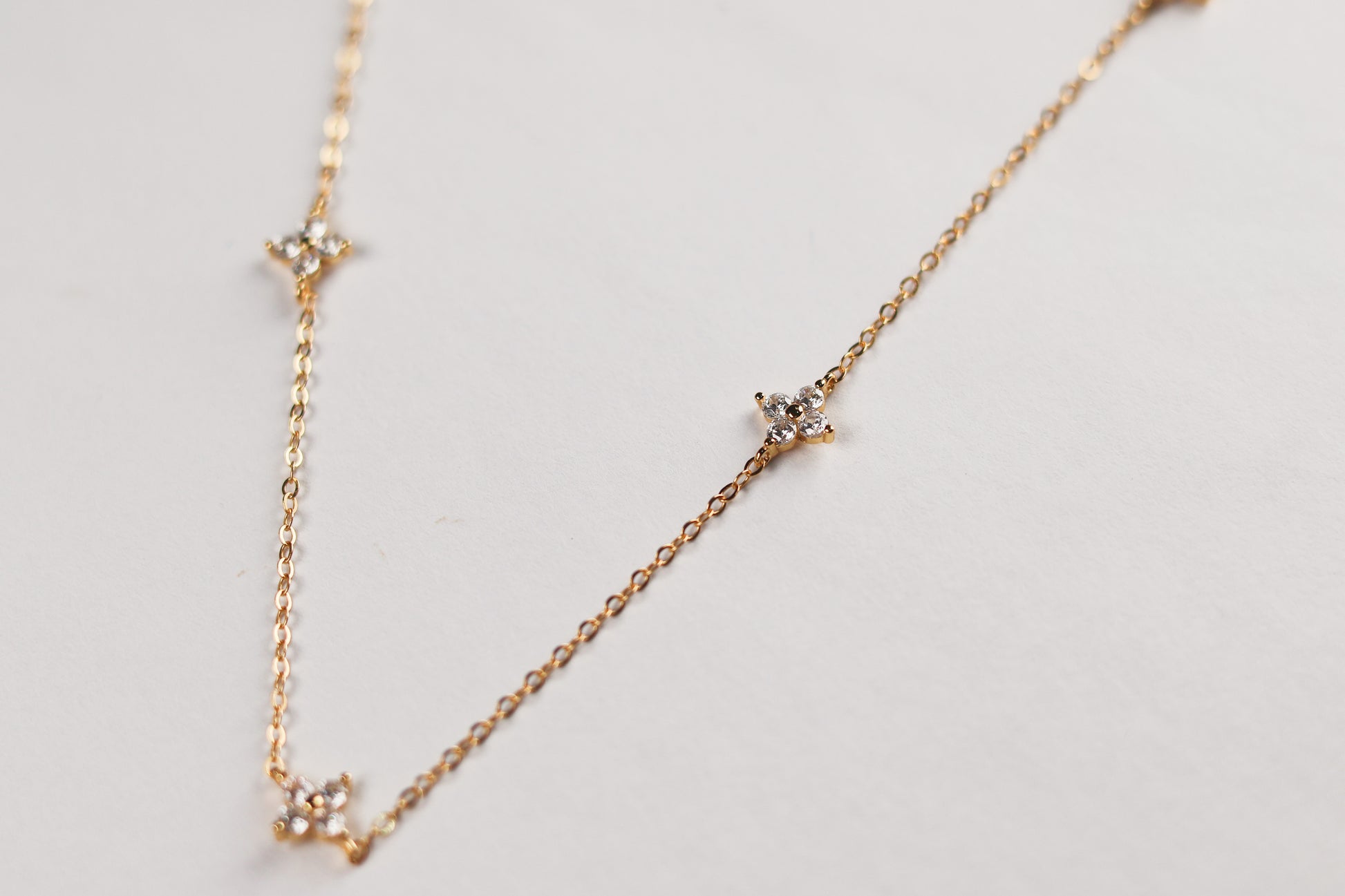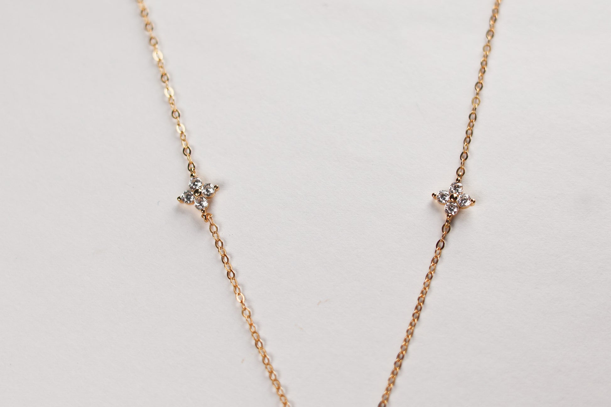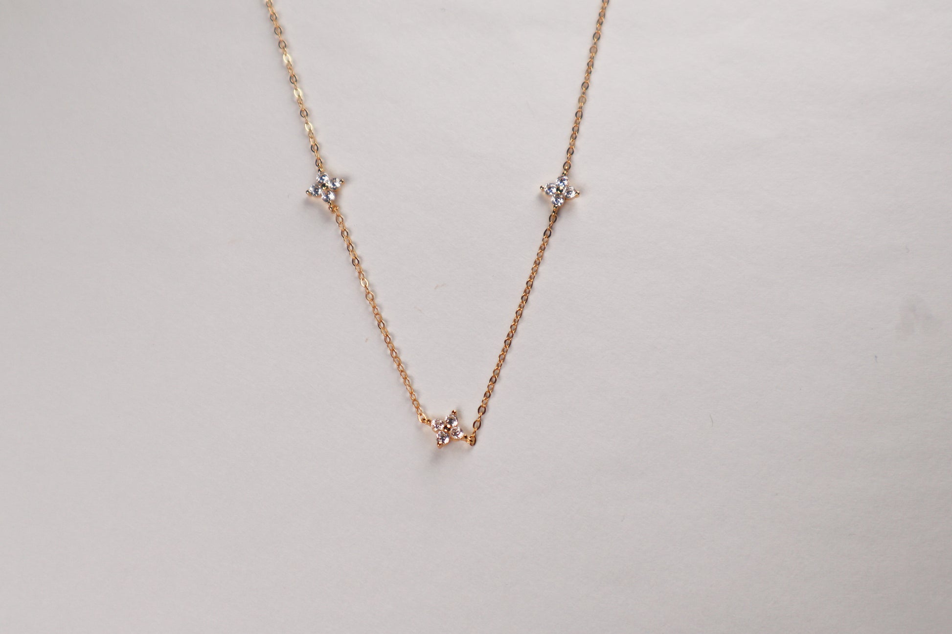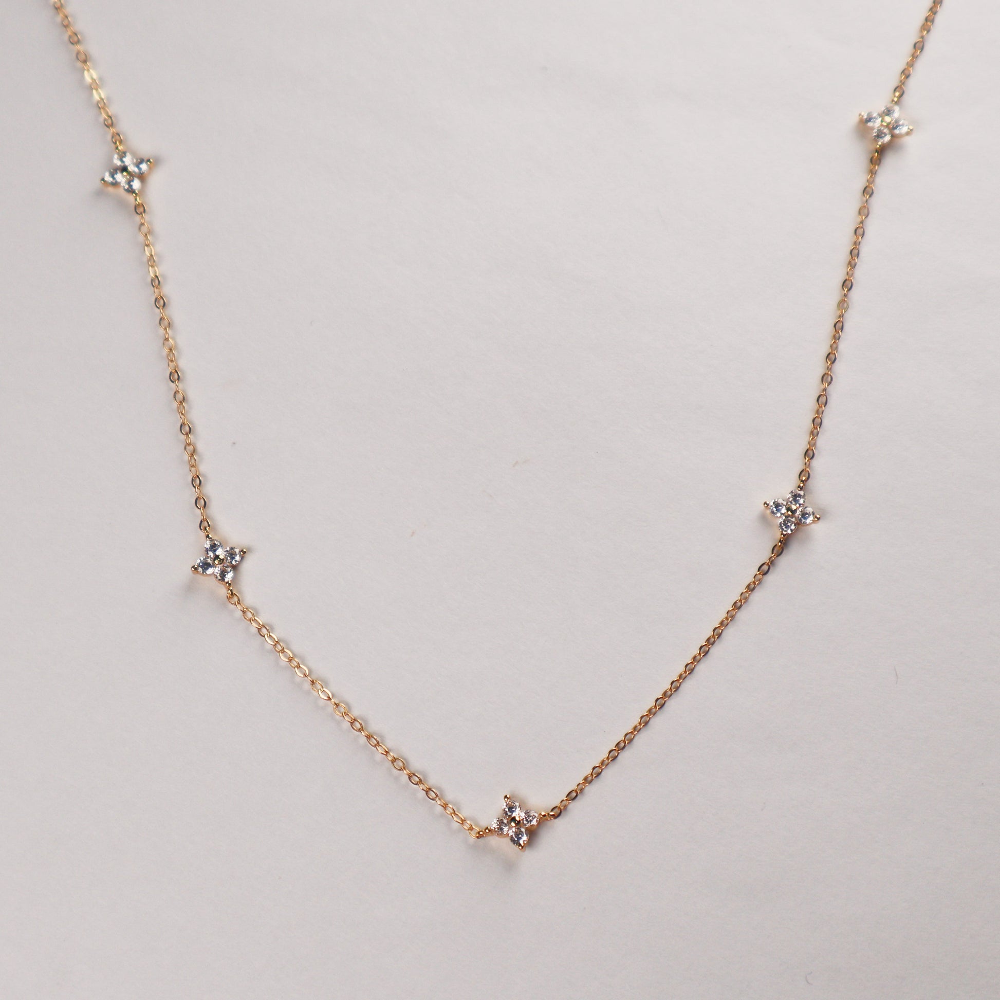 Collar delicado con detalles en forma de flor tipo clover, elaborado en plata 925 enchapado en oro de 18k. Su diseño sutil y femenino aporta un brillo discreto que eleva cualquier look sin esfuerzo. Perfecto para quienes aman las piezas finas, ligeras y fáciles de combinar. Ideal para usar solo o en layering y darle un toque romántico y minimal a tu día a día.